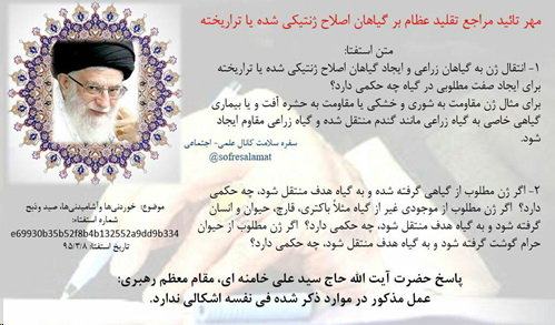 تصویر 1: فتوای صریح مقام معظم رهبری مبنی بر جواز مهندسی ژنتیک و تولید محصولات تراریخته