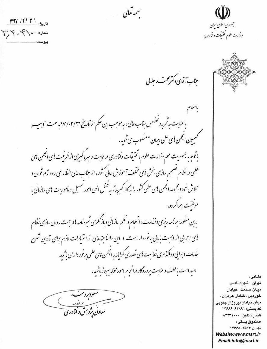 معاون پژوهش و فناوری وزارت علوم، تحقیقات و فناوری در حکمی دکتر محمد جلالی را به سمت «دبیر کمیسیون انجمن های علمی ایران» منصوب کرد.
