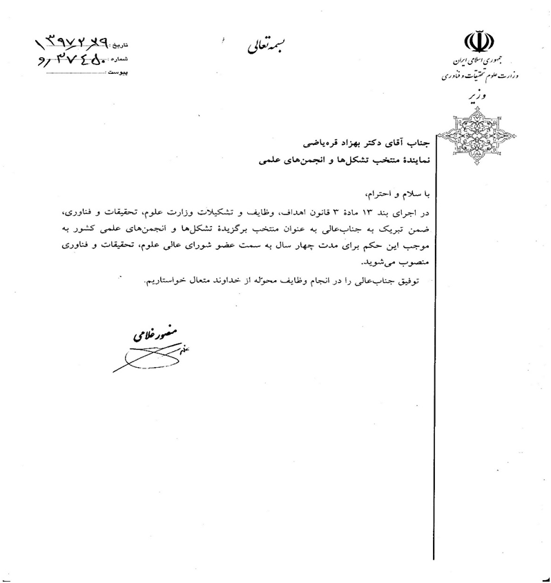 طی احکامی از سوی وزیر علوم، تحقیقات و فناوری، آقای دکتر بهزاد قره یاضی، رئیس انجمن ایمنی زیستی و انجمن علوم زراعت و اصلاح نباتات و دکتر مجید قاسمی، رئیس شورای انجمن های علمی کشور، به عضویت شورای عالی علوم، تحقیقات و فناوری (عتف) منصوب شدند.