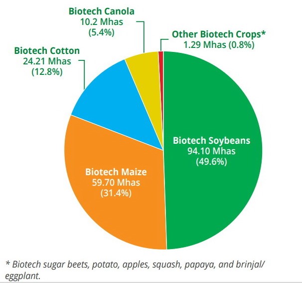 چهار محصول سویا، ذرت، پنبه و کلزا نسبت به سایر محصولات تراریخته سطح زیر کشت بیشتری را در 24 کشور تولید کننده این محصولات داشتند.سویا با 94.1 میلیون هکتار پنجاه درصد کل سطح زیر کشت محصولات تراریخته را به خود اختصاص داد و نسبت به سال قبل 3 درصد افزایش داشت. ذرت 59.7، پنبه 24.1 و کلزا 10.2 میلیون هکتار از سطح زیر کشت محصولات تراریخته را به خود اختصاص دادند.
