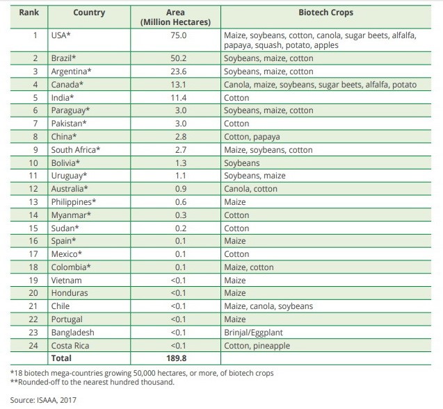 آمریکا با 75 میلیون هکتار رتبه اول، برزیل با 50.2 میلیون هکتار رتبه دوم، آرژانتین با 23.6 میلیون هکتار رتبه سوم، کانادا با 13.1 میلیون هکتار رتبه چهارم و هند با 11.4 میلیون هکتار رتبه پنجم در سطح زیر کشت محصولات تراریخته را داشتند.مجموعا 173.3 میلیون هکتار در این پنج کشور زیر کشت محصولات تراریخته رفت. 1.95 میلیارد نفر (26 درصد از جمعیت 7.6 میلیارد نفری کره زمین) در این پنج کشور از مزایای این فناوری بهره مند شدند.