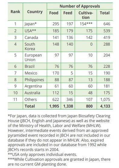 رخداد ذرت تراریخته متحمل به علفکش به نام NK603 با 55 مجوز در 54 کشور شامل 28 کشور عضو اتحادیه اروپایی بیشترین تعداد مجوز را دریافت کرده است. سویای تراریخته متحمل به علف کش به نام رخداد GTS 40-3-2، 54 مجوز در 28 کشور عضو اتحادیه اروپایی و 27 کشور غیراروپایی دریافت کرده است. برای ذرت تراریخته مقاوم به آفت به نام MON810، 53 مجوز در 28 کشور عضو اتحادیه اروپایی و 26 کشور غیراروپایی صادر شده است. ذرت تراریخته مقاوم به آفت به نام TC1507، 51 مجوز در 28 کشور عضو اتحادیه اروپایی 24 کشور غیر اروپایی دارد. ذرت تراریخته متحمل به علفکش به نام GA21 مجموعا 50 مجوز در 28 کشور عضو اتحادیه اروپایی و 24 کشور غیر اروپایی دریافت کرده است. ذرت تراریخته مقاوم به آفت به نام MON89034، 49 مجوز از 28 کشور عضو اتحادیه اروپایی و 24 کشور غیر اروپایی دریافت کرده است. سویای تراریخته متحمل به علفکش به نام A2704-12، 43 مجوز از 28 کشور اروپایی و 23 کشور غیر اروپایی دریافت کرده است. ذرت تراریخته مقام به آفت به نام MON88017 از 28 کشور عضو اتحادیه اروپایی و 22 کشور غیراروپایی، 42 مجوز دریافت کرده است. پنبه مقاوم به آفت به نام MON531 43 مجوز از 28 کشور عضو اتحادیه اروپایی و 21 کشور غیر اروپایی دریافت کرده است. ذرت تراریخته متحمل به علف کش به نام T25، 41 مجوز از 28 کشور عضو اتحادیه اروپایی و 20 کشور غیر اروپایی دریافت کرده است. ذرت تراریخته مقاوم به آفت به نام MIR162، 41 مجوز از 28 کشور عضو اتحادیه اروپایی و 22 کشور غیراروپایی دریافت کرده است.