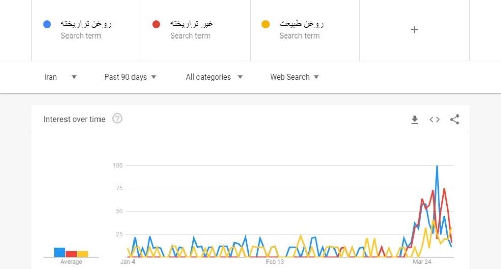 نتیجه حاصل از GoogleTrend برای کلمات: “روغن تراریخته” “غیر تراریخته” “روغن طبیعت” در بازه زمانی سه ماهه اول سال جاری