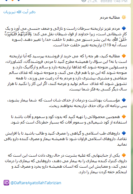 عباس تبریزیان، همان که کتاب پزشکی هاریسون را سوزاند و اعتبار فرهنگی ایرانیان را در جهان خدشه دار کرد، مبلغ روغن بنفشه برای درمان کرونا و مخالف واکسیناسیون. حامی عمرانی و پروفسور کرمی و علیرضا عباسی نماینده مردم کرج در مجلس شورای اسلامی در مورد محصولات تراریخته افاضه فیض کرده اند: همه با هم بخوانیم و حظ کنیم.