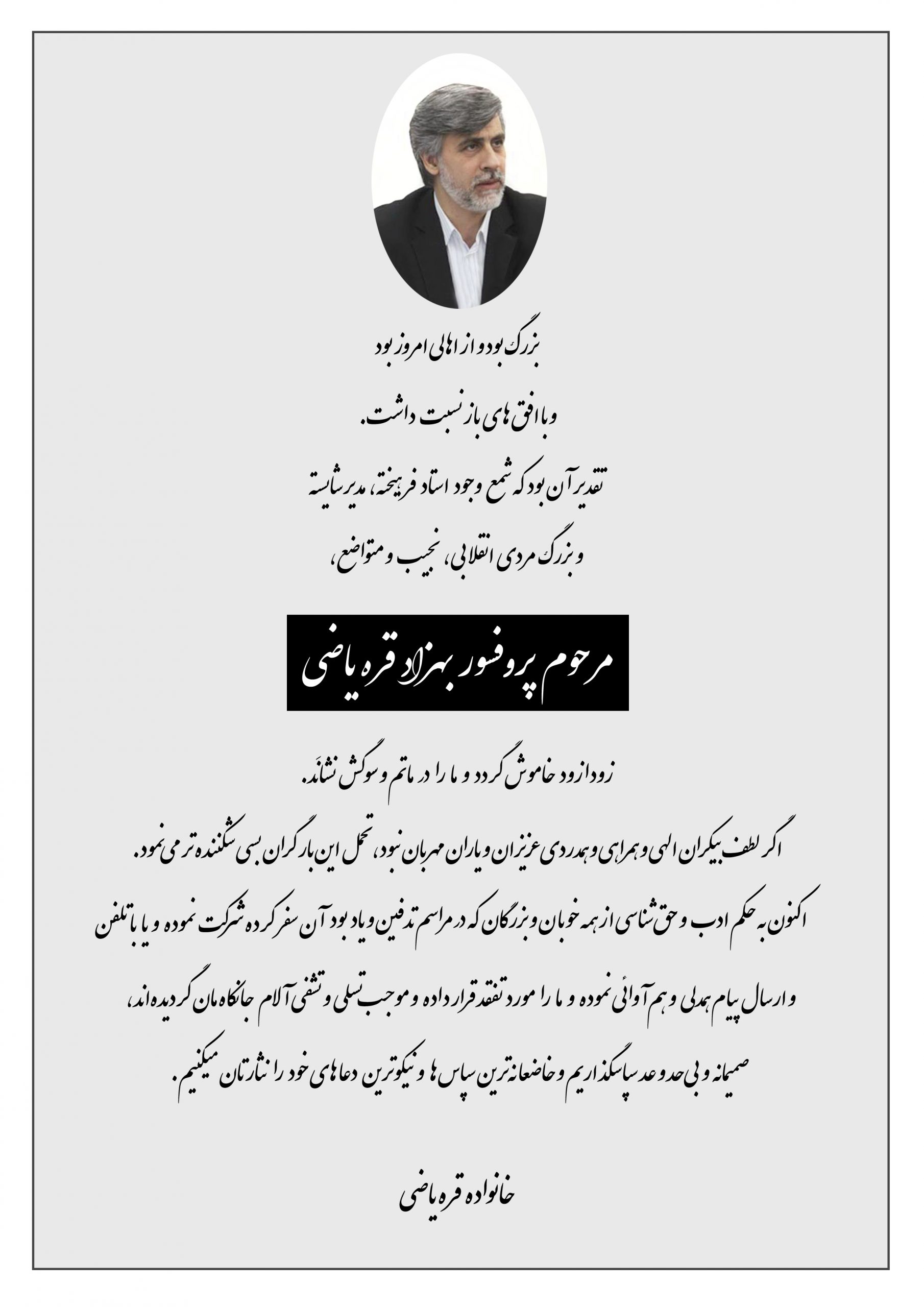 پیام تشکر و قدردانی خانواده زنده یاد پروفسور بهزاد قره یاضی