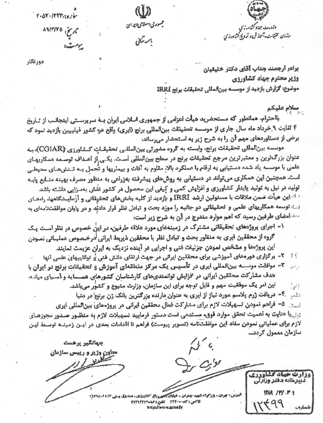 در ادامه، برای روشن سازی افکار عمومی در زمینه همکاری های گسترده جمهوری اسلامی ایران و موسسه ایری، می توان به بازدید رییس پژوهشکده بیوتکنولوژی کشاورزی در سال 1389 از موسسه ایری اشاره کرد. در این سال هیئتی مرکب از آقای دکتر جهانگیر پرهمت (رییس سازمان تحقیقات، آموزش و ترویج کشاورزی وقت) و آقای مجتبی خیام نکویی (رییس وقت پژوهشکده بیوتکنولوژی کشاورزی در سال 89) از موسسه تحقیقات بین المللی برنج واقع در فیلیپین بازدید کردند و طی این بازدید موافقت نامه ای را برای اجرای پروژه های تحقیقاتی مشترک با این موسسه امضا کردند. گزارش این بازدید را ببینید: