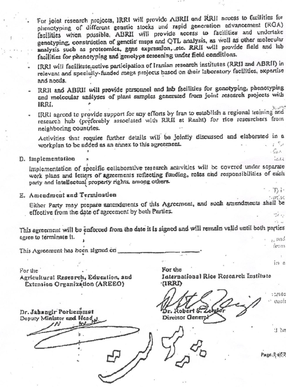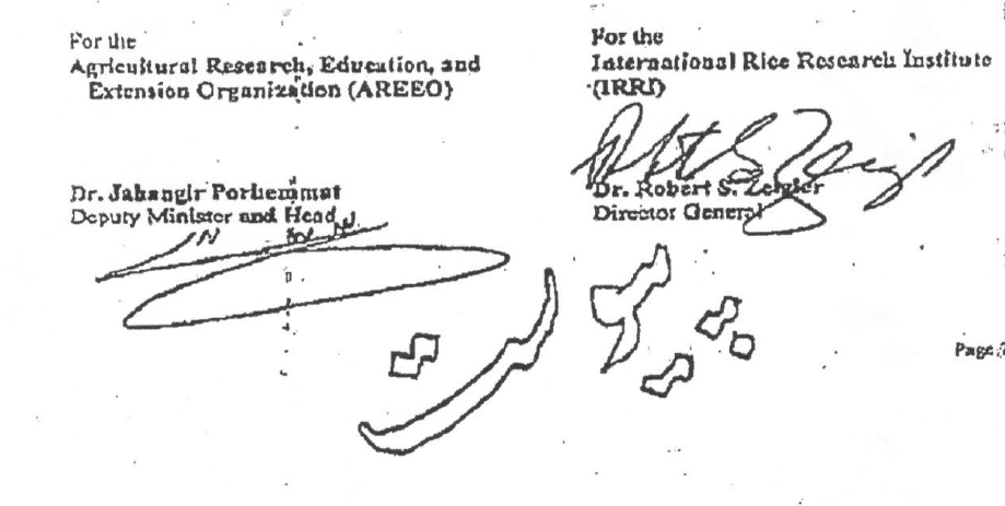 در ادامه، برای روشن سازی افکار عمومی در زمینه همکاری های گسترده جمهوری اسلامی ایران و موسسه ایری، می توان به بازدید رییس پژوهشکده بیوتکنولوژی کشاورزی در سال 1389 از موسسه ایری اشاره کرد. در این سال هیئتی مرکب از آقای دکتر جهانگیر پرهمت (رییس سازمان تحقیقات، آموزش و ترویج کشاورزی وقت) و آقای مجتبی خیام نکویی (رییس وقت پژوهشکده بیوتکنولوژی کشاورزی در سال 89) از موسسه تحقیقات بین المللی برنج واقع در فیلیپین بازدید کردند و طی این بازدید موافقت نامه ای را برای اجرای پروژه های تحقیقاتی مشترک با این موسسه امضا کردند. گزارش این بازدید را ببینید: