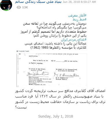 برای یک نمونه وی در تاریخ 14 تیر سال جاری، مطلبی را با هشتگ “خط ربط” (!) در کانال تلگرام مذکور منتشر کرده است. وی که طبق روال معهود خود تلاش دارد خود را کسی معرفی کند که مرجع حقیقت است در این مطلب می نویسد: «امروز می خواهم یکی از این خطوط را برایتان روشن کنم» و در کنار آن تصویر امضای دکتر عیسی کلانتری در موافقت نامه ای که بین جمهوری اسلامی ایران و موسسه بین المللی تحقیقات برنج منعقد شده است را منتشر کرده است. وی با تقطیع یک موافقت نامه، از موسسه بین المللی برنج در فیلیپین با عنوان سراسر کذب «بنیاد صهیونیستی راکفلر» نام برده! و به گونه ای وانمود کرده است که یک مسئله سری و مجرمانه را افشا کرده است (تصویر 1).