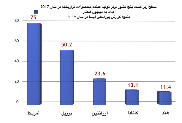 پنج کشور آمریکا، آرژانتین، برزیل، کانادا و هند مجموعا 91.3 درصد و 173.3 میلیون هکتار، از کل سطح زیر کشت محصولات تراریخته را به خود اختصاص دادهاند. آمریکا با 75 میلیون هکتار رتبه اول، برزیل با 50.2 میلیون هکتار رتبه دوم، آرژانتین با 23.6 میلیون هکتار رتبه سوم، کانادا با 131.1 میلیون هکتار رتبه چهارم و هند با 11.4 میلیون هکتار رتبه پنجم را در سطح زیر کشت محصولات تراریخته داشتهاند. بهاینترتیب 26 درصد از جمعیت میلیاردنفری کره زمین در این پنج کشور از مزایای فناوری تولید محصولات تراریخته بهرهمند شدند.