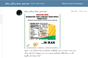 تصویر1-ادعای جعلی تلاش برای قانونی شدن برچسب گذاری محصولات تراریخته در یک کانال تلگرامی