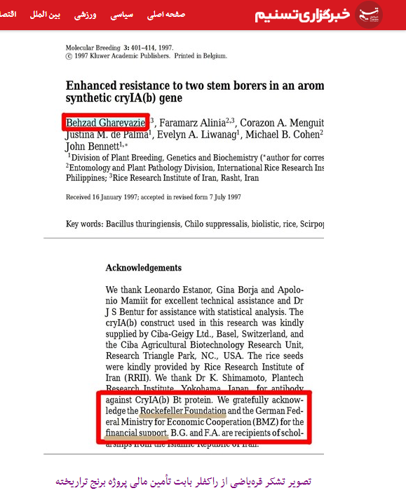 این روایتی بر اساس مستندات موجود است. دسترسی به این مقاله برای عموم آزاد است (لینک مقاله: https://link.springer.com/article/10.1023/A:1009695324100). اما محفل ضد تراریخته در خبرگزاری تسنیم به سیاق معهودشان دست به تقطیع و سانسور هدفمند بخش تشکر و قدردانی مقاله علمی زده اند تا وانمود کنند منادی فناوری تراریخته، سپاسگزار راکفلر بوده است و در موقعیتی مناسب بتوانند از اتهام های واهی علیه پژوهشگران متعهد کشور نیز بهره های کافی و وافی ببرند.
