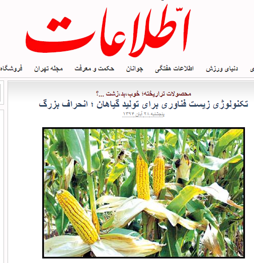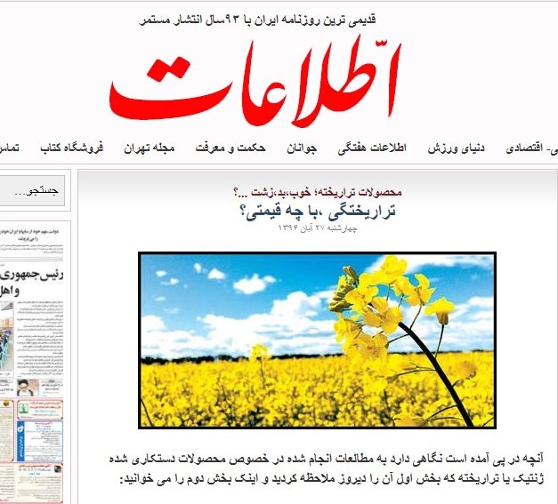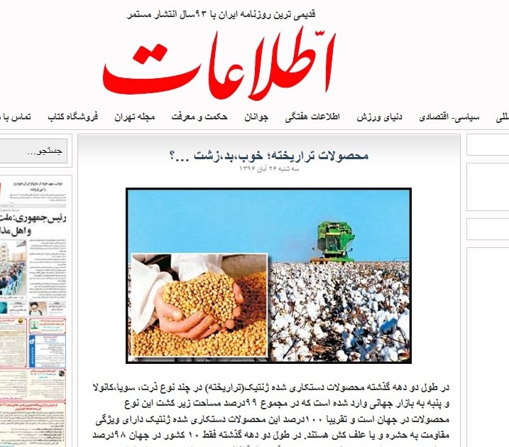 تصویر 3. مطلب منتشر شده علیه محصولات تراریخته در روزنامه اطلاعات توسط اقای اردکانی در تاریخ 27 آبان 1394