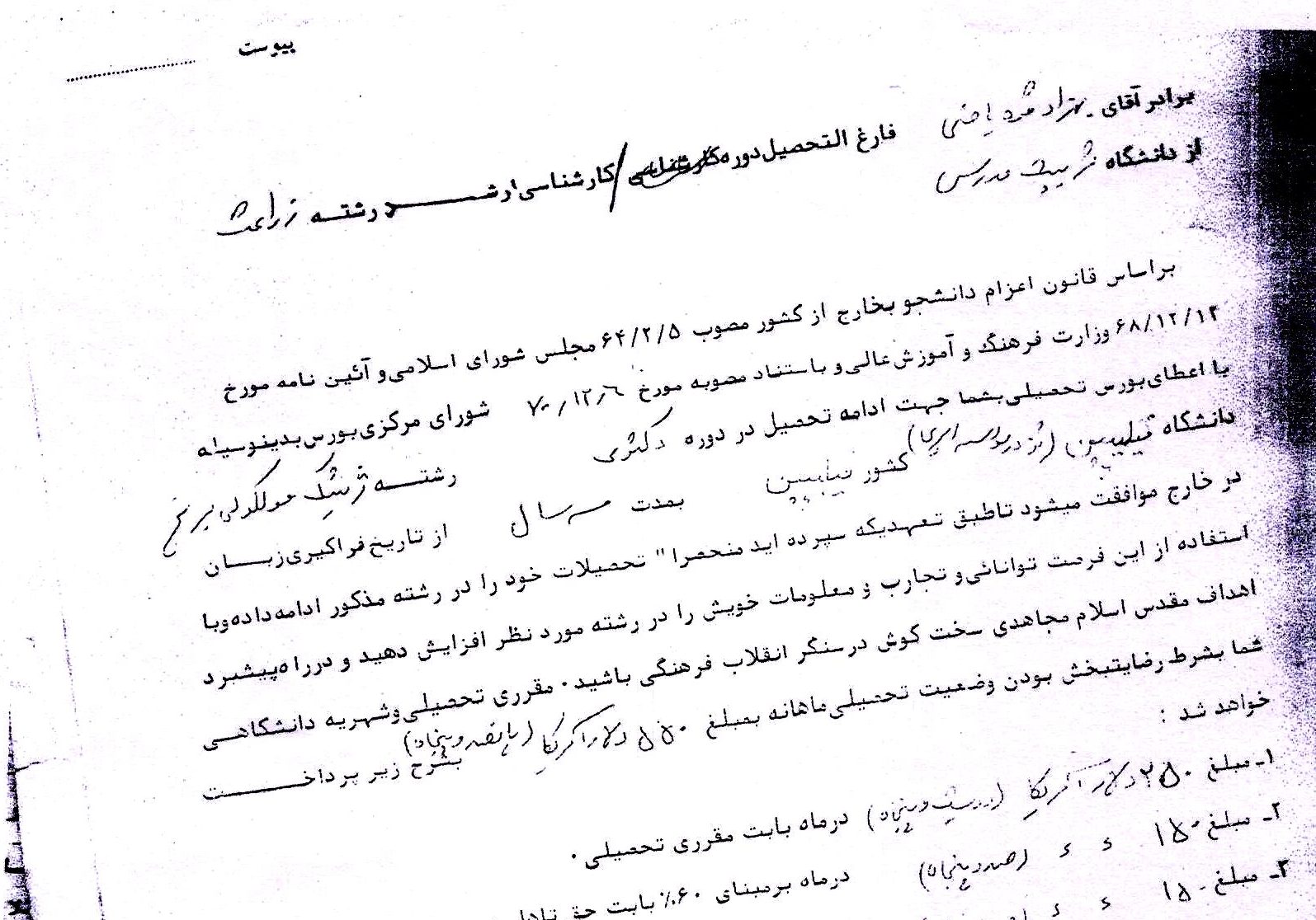 چگونه است که سال ها تحصیل در امریکا و عکس گرفتن با دیوارهای آن افتخار می آفریند (تصویر 8) و امبرکبیر می سازد! اما دانشجویی که با بورسیه جمهوری اسلامی ایران دوره دکتری اش را در موسسه بین المللی تحقیقات برنج گذرانده است (تصویر 9) و پایان نامه دکتری خود را تقدیم به امام راحل و شهدای انقلاب اسلامی کرده است (تصویر 10)، جاسوس خوانده می شود؟ پاسخ با شما. چرا که این سوالی است که گردانندگان مزرعه پدری هرگز پاسخ آن را به جامعه علمی نخواهند داد……