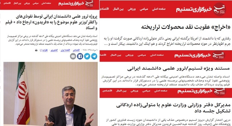 3)خبرگزاری تسنیم/ عنوان خبر: پروژه ترور علمی دانشمندان ایرانی توسط نفوذیهای راکفلر/وزیر علوم موضوع را به «فریدون» ارجاع داد/ تاریخ خبر: 10 مرداد 1395.