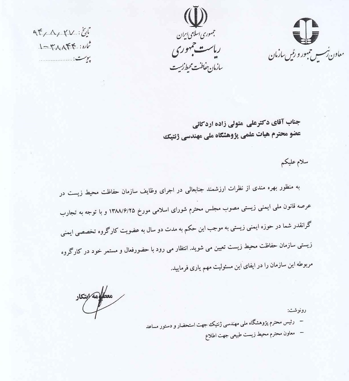 تصویر 5. تصویر حکم آقای اردکانی. وی همزمان با انتشار مطالبی در مخالفت با محصولات تراریخته، در تاریخ 27 آبان 94 به عضویت کار گروه تخصصی ایمنی زیستی تعیین شده است.