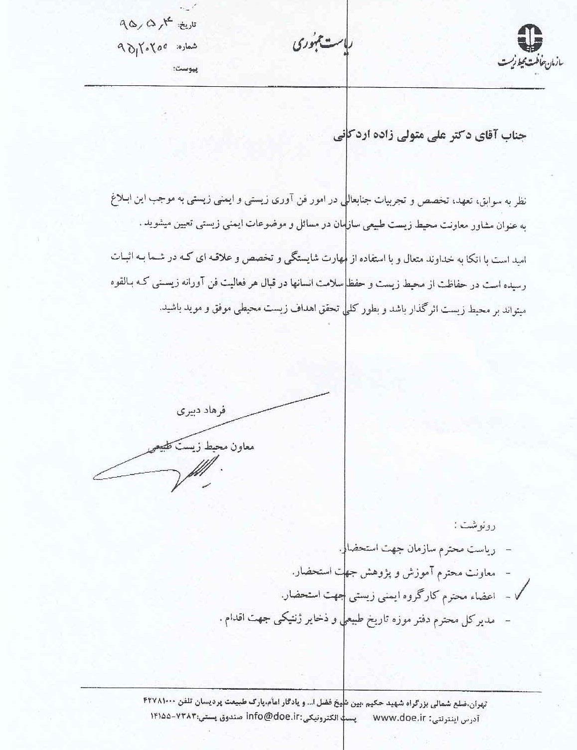 تصویر 6. حکم آقای اردکانی. وی مدت کوتاهی پس از انتشار مطالبی بر علیه محصولات تراریخته به عنوان مشاور معاونت محیط زیست طبیعی سازمان حفاظت محیط زیست تعیین شده است.