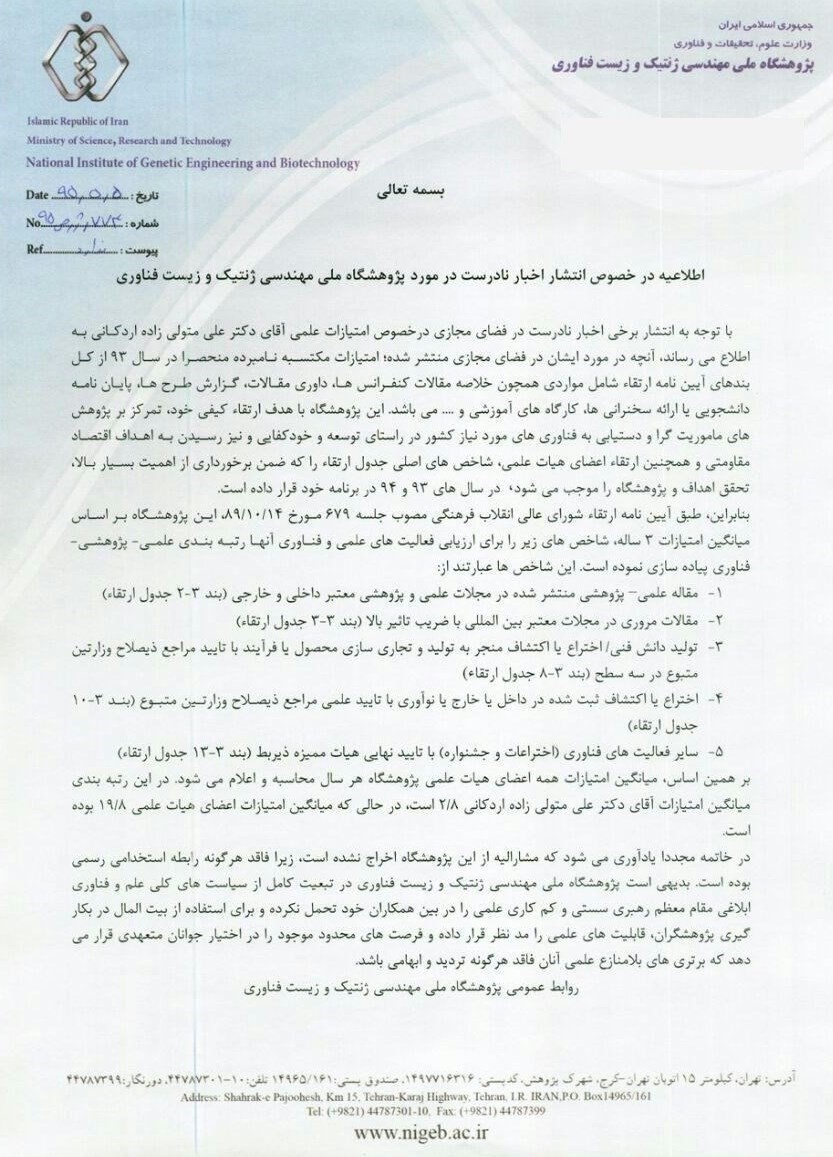 تصویر7. اطلاعیه پژوهشگاه ملی مهندسی ژنتیک در خصوص ادعای اخراج آقای متولی زاده اردکانی