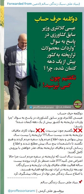 دوم: آقای کرمی مدعی شده است: مافیای تراریخته! بیست سال «پنهانی» تراریخته را وارد کشور کرده اند. اگرچه پروفسور به گفتن حرفهای بی سند عادت دارد اما از ایشان می خواهیم سندی ارائه کنند که پژوهشگران عرصه مهندسی ژنتیک در کشور وارد کننده محصولات تراریخته هستند! بر عکس، دانشمندان متعهد به توسعه و پیشرفت نظام جمهوری اسلامی ایران، مدت هاست که از ورود محصولات تراریخته به کشور خبر می دهند.