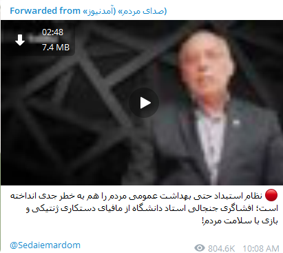 برای مثال مطلبی با عنوان «نظام استبداد حتی بهداشت عمومی مردم را هم به خطر جدی انداخته است؛ افشاگری جنجالی استاد دانشگاه از مافیای دستکاری ژنتیکی و بازی با سلامت مردم!» (تصویر 1) بیشتر از هشتصد هزار بازدید در کانال تلگرامی آمدنیوز داشته است که با احتساب باز نشر آن در بین توده مردم، عوام و حتی مسئولین اثرگذاری منفی آن بسیار بیشتر است.