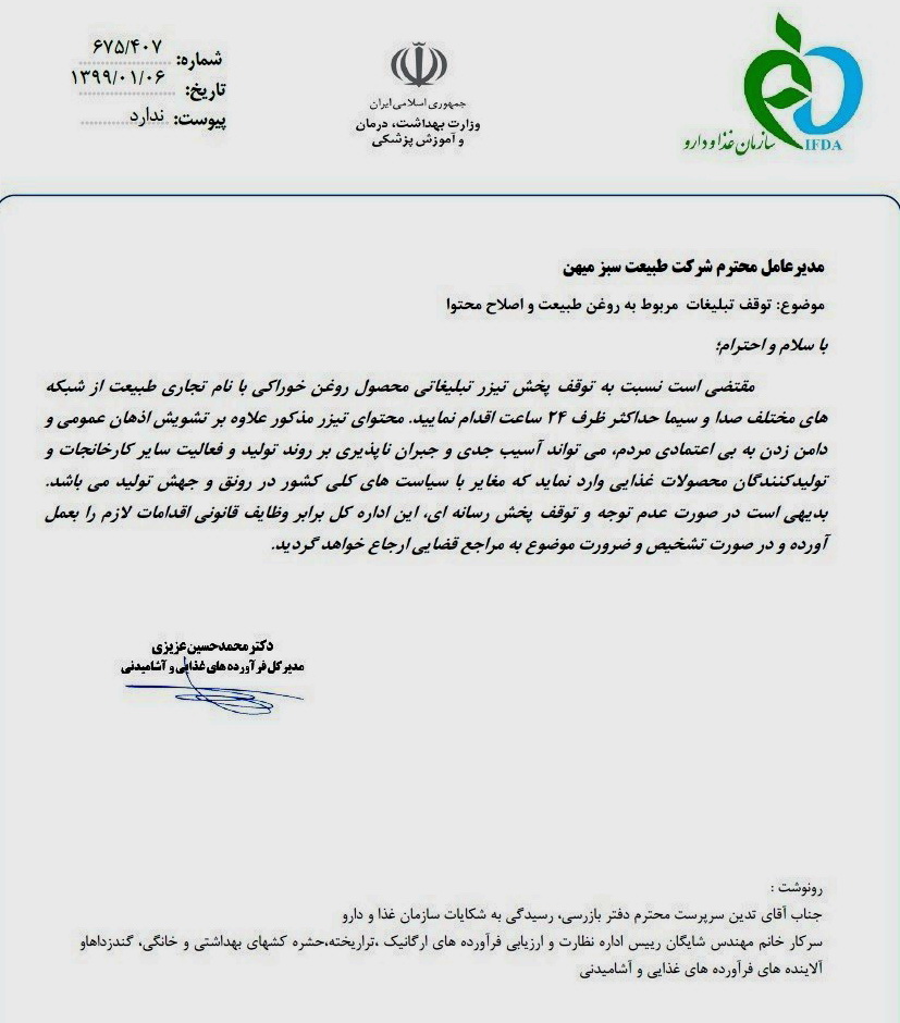 ضمن تقدیر از دکتر عزیزی و تیم همکاران جهادی وی در وزارت بهداشت و سازمان غذا و دارو که اخیرا “به دلیل مخالف” با تبلیغات فریبکارانه و میلیاردی شرکت طبیعت تحت وحشیانه ترین حملات رسانه های زنجیره ای خاص قرار دارند تاکید می شود که ایران منحصرا تابع قوانین و مقررات داخلی خود است که منبعث از آموزه های دین مبین اسلام است.