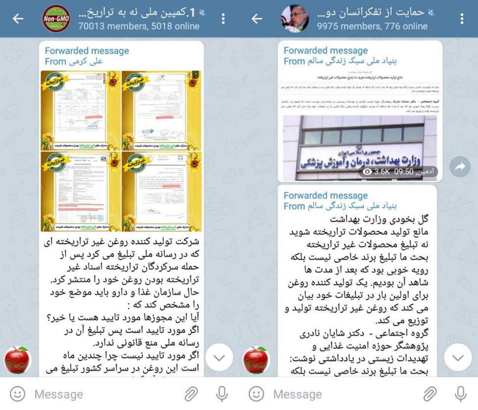 - استقبال جریان خاص و رسانه های زنجیرهای مجازی مانند بنیاد ملی خود خوانده و غیر قانونی تلگرامی سبک زندگی سالم (آقای علی کرمی، تصویر ۳)، محفلی خاص در تسنیم و اذنابشان از تبلیغات شرکت طبیعت و تبلیغ ضد تراریخته. این جریان به سرکردگی محفل تسنیم ضمن حمله شدید به وزارت بهداشت درمان و آموزش پزشکی از اینکه آگهی های یاد شده تاثیر غیر قابل جبران خود را بر جای گذاشته و آب ریخته را نمی توان جمع کرد (که تا حدودی درست هم هست) ابراز مسرت کرده اند (طرفداری پرسش برانگیز “سازمان غذا و دارو” از محصولات تراریخته + سند / سخنی با تاجران تراریخت فروردین ۱۳۹۹ ۱۲:۴۴ اقتصادی کشاورزی)