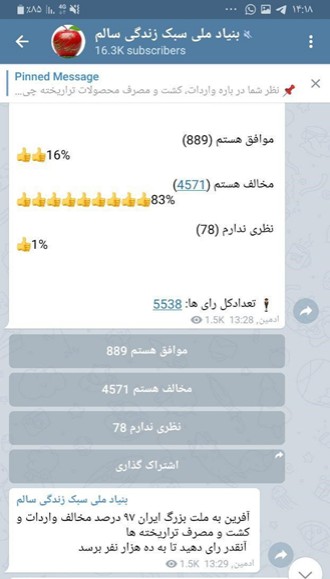 این نظرسنجی در تمام کانال ها و گروههای تلگرامی مخالفان تولید ملی محصولات تراریخته، به اشتراک گذاشته شد. تعداد مجموع اعضای ادعایی این گروهها و کانالهای مجازی که با عناوین مختلفی همچون «کمپین نه به تراریخته» و «بنیاد سبک زندگی سالم» فعالیت میکنند، به ظاهر به بیش از ۲۰۰ هزار نفر میرسد. اما پس از گذشت چندین روز از نظرسنجی کل تعداد کسانی که در این گروه ها رای مخالف به محصولات تراریخته داده بودند به چهار هزار و پانصد نفر رسید! (تصویر ۱). سپس در یک پست تلگرامی (تصویر ۱) اعلام کردند: «آفرین به ملت بزرگ ایران! ۹۷ درصد مخالف واردات و کشت و مصرف تراریخته ها! آنقدر رای دهید تا به ده هزار نفر برسد». عجبا! کل ملت بزرگ ایران از منظر ایشان حداکثر ۱۰ هزار نفر هستند!