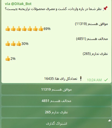 بدیهی است هر پست تلگرامی (به ویژه پست نظر سنجی که اساسا برای به اشتراک گذاری و نظر خواهی طراحی شده است)، به سرعت در فضای مجازی منتشر میشود. نظر سنجی فوق نیز در فضای مجازی منتشر شد و در اختیار گروههای دانشجویی، انجمنهای علمی و اساتید قرار گرفت و به تدریج آرای دانشجویان و اساتید و پژوهشگران کشاورزی، که در این زمینه صاحب تخصص هستند، موجب شد تا این وضعیت کاملا تغییر کند و به ۶۹ درصد از پاسخ دهندگان موافق تراریخته و ۳۰ درصد مخالف برسد (تصویر ۲). البته به خاطر طراحی نادرست گزینههای این نظر سنجی، خیلی از پژوهشگران بیوتکنولوژی از پاسخ دهی به آن اجتناب کردند. چرا که هیچ گزینهای برای مخالفت با واردات و موافقت با تولید ملی و مصرف محصولات تراریخته در این نظرسنجی طراحی نشده بود و عده زیادی از متخصصین بیوتکنولوژی نیز این قبیل نظر سنجیها را فاقد اعتبار علمی دانسته و در آن شرکت نکردند.