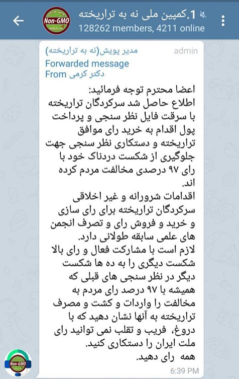جریان بددل و بدخواه با تصور اینکه عوام فریبیهایش نتیجه بخش بوده این نمایش نظرسنجی را ترتیب داد. اما نتایج به نحو دیگری رقم خورد و آرای موافقان تراریخته به سرعت پیشی گرفت و تا جایی که مدعیان رای ۹۷ درصدی مردم! مدعی شدند پست تلگرامی نظرسنجی به سرقت رفته است (!؟) (تصویر ۳) و فایل نظر سنجی را از کمپینهای خود حذف کردند. چنین ادعاهای سخیفی در خصوص انتشار یک پست تلگرامی نشان دهنده عمق استیصال جریان کج اندیش در برابر تلاش بیوقفه نخبگان و پژوهشگران بیوتکنولوژی است.