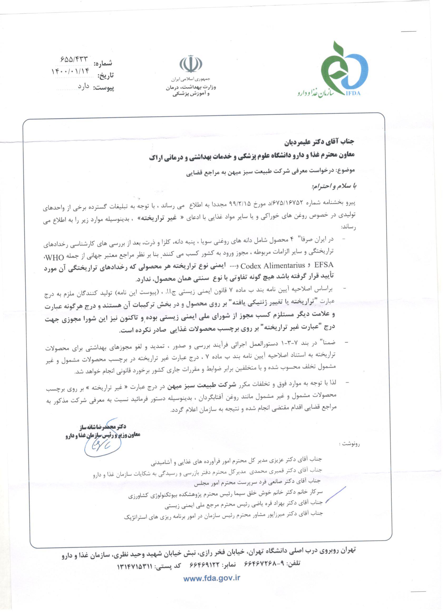 نامه سازمان غذا و دارو برای توقف تبلیغات شرکت طبیعت سبز میهن (اینجا)