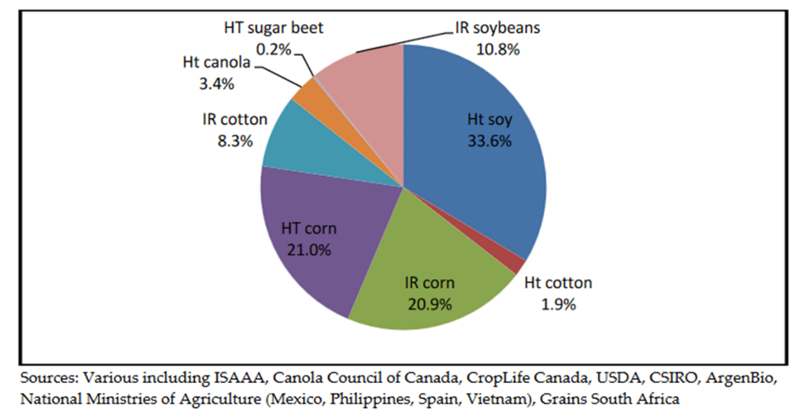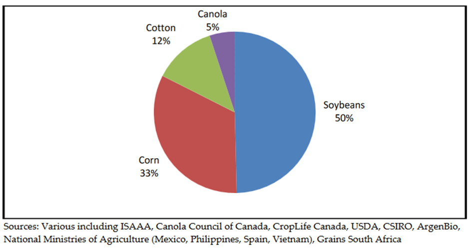 سویا تراریخته متحمل به علف کش بیشترین سهم تولید جهانی را به خود اختصاص داده است (6/33 درصد) پس از آن ذرت متحمل به علف کش، ذرت، سویا و پنبه مقاوم به آفات به ترتیب بیشترین سهم از کشت محصولات تراریخته را به خود اختصاص داده اند (21%، 20.9%، 10.8% و 8.3%).