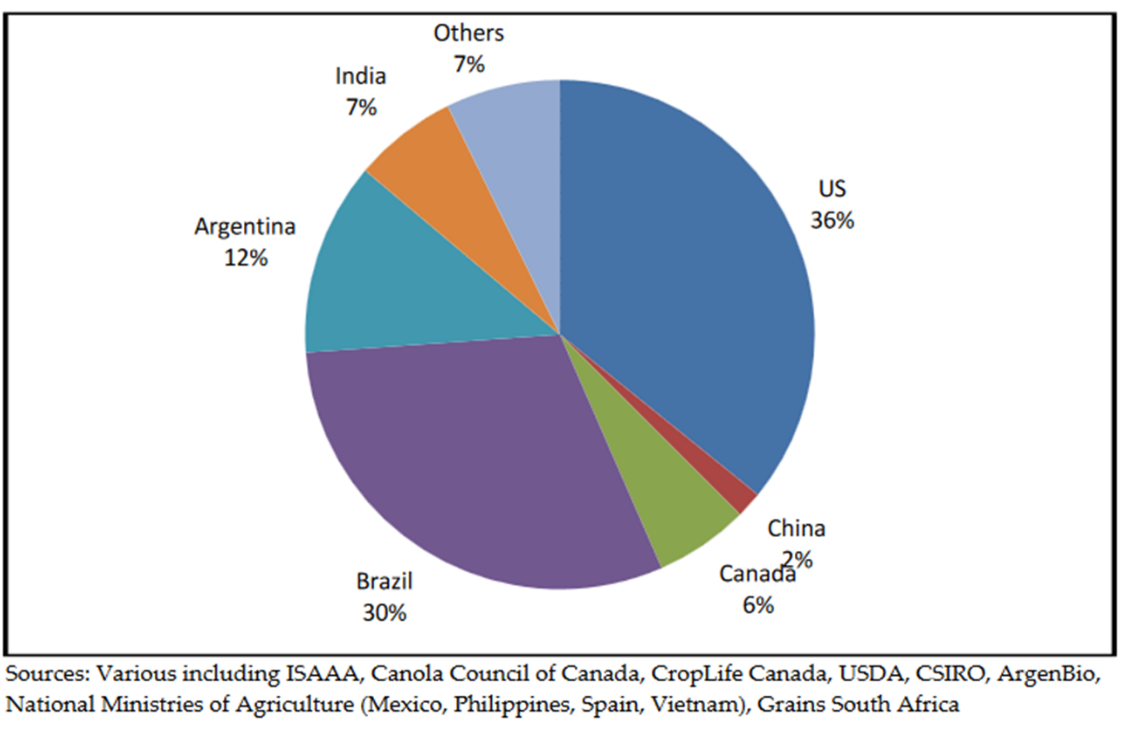 در سال 2020 کشورهای اصلی کاشت محصولات تراریخته آمریکا، برزیل آرژانتین، هند، کانادا و چین بودند که ایالات متحده آمریکا بیشترین سهم را در کشت محصولات تراریخته (36٪) و پس از آن برزیل (30٪) در این سال داشتند.
