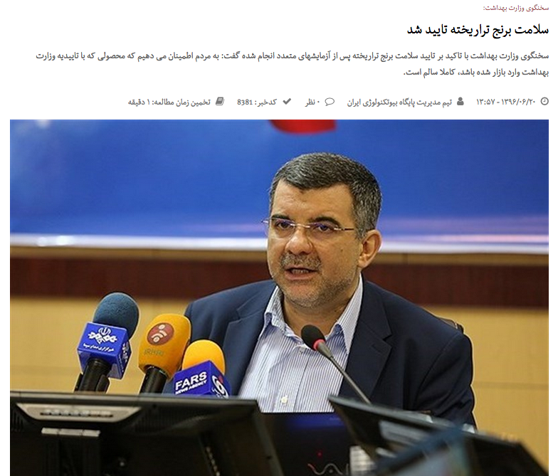 پیش از آن ایرج حریرچی سخنگوی وزارت بهداشت در نشست خبری هفتگی خود ضمن بیان اینکه سیاست وزارت بهداشت درباره محصولات تراریخته و به طور کلی محصولات غذایی این است که به طور موردی ارزیابی شوند گفت: تولید محصولات کشاورزی اصلاح شده سال‌هاست که انجام می‌شود و در مورد برخی از این محصولات مانند سویا، بازار دنیا تقریبا در انحصار محصولات تراریخته است. در کشور ما نیز برخی از این محصولات با مجوز وزارت بهداشت وارد بازار شده و به مردم اطمینان می‌دهیم که محصولی که با تاییدیه وزارت بهداشت وارد بازار شده باشد، کاملا سالم است.
