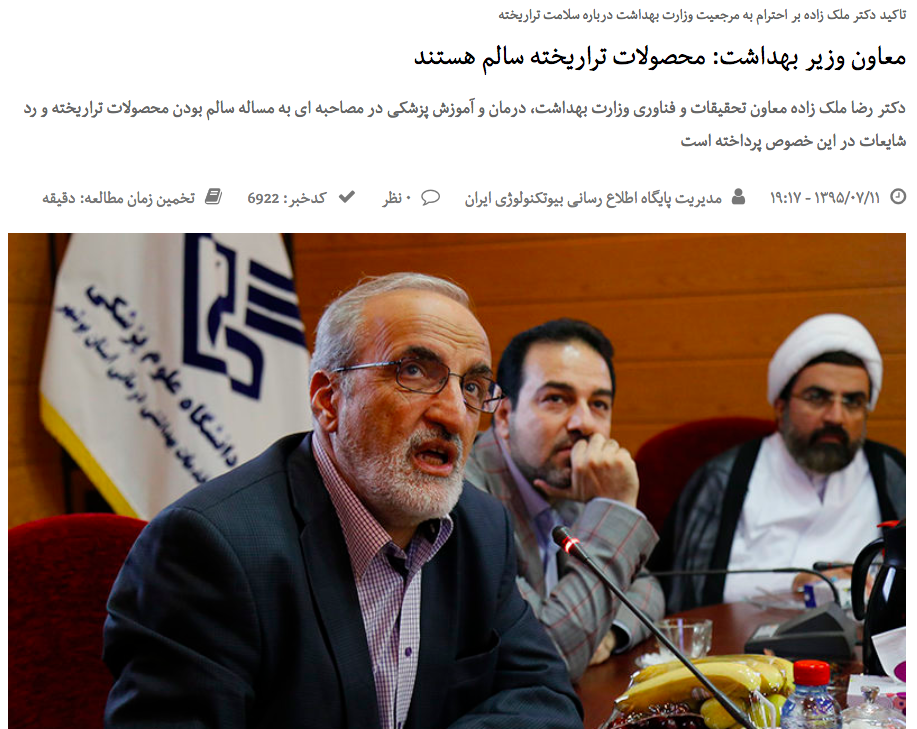 أواخر مهرماه بود که دکتر جنت، مدیر کل أمور غذایی، آرایشی و بهداشتی وزارت بهداشت بر سلامت محصولات تراریخته تاکید کرد. وی در نشست خبرى همایش ملی روز جهانی غذا با تاکید بر بی‌اعتباری ادعاهای جریان ضد تراریخته گفت: مردم خیال‌شان راحت باشد که محصولات تراریخته مورد تایید سازمان غذا و دارو از لحاظ استفاده انسانی مجاز و مورد تایید است.
