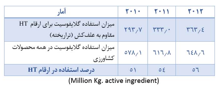 نکته پایانی اینکه گلایفوسیت یک علفکش بسیار پراستفاده در کشاورزی و حتی صنعت است و به هیچ وجه سم اختصاصی محصولات تراریخته محسوب نمیشود تا با نفی آن بتوان محصولات تراریخته را نفی کرد. این علفکش بیش از ۵۰ سال است کاربرد گستردهای در کشاورزی دارد در حالی که تولید محصولات تراریخته تنها ۲۰ سال است صورت میگیرد.[11] همچنین تنها برخی ارقام تراریخته مقاوم به علفکش هستند و پژوهشکده بیوتکنولوژی کشاورزی جمهوری اسلامی ایران نیز در حال توسعه ارقام مقاوم به علفکشهای دیگر است؛ بنابراین نتیجهگیریهایی که بر این اساس صورت میگیرد به روشنی خلاف واقع و گمراه کننده است.