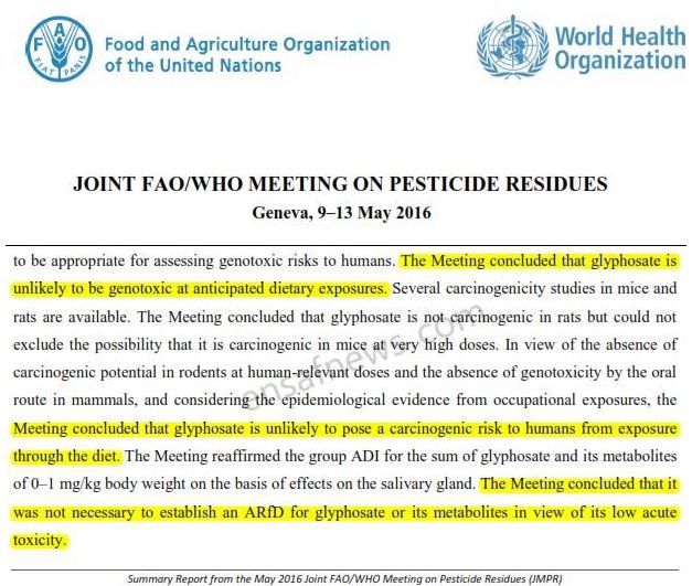 بلافاصله پس از انتشار گزارش مرکز تحقیقات سرطان در سال 2015 سازمان جهانی بهداشت با برگزاری نشست مشترک سازمان جهانی بهداشت و سازمان خوار و بار جهانی به بررسی گزارش مرکز تحقیقات سرطان درباره گلایفوسیت پرداخته و مقرر شد گزارش جامعی در این باره تهیه و در آن نظر مشترک سازمان جهانی بهداشت و فائو در این باره اعلام شود. گزارش بعدی سازمان جهانی بهداشت و سازمان خوار و بار جهانی پس از مطالعات تکمیلی که در ماه می ۲۰۱۶ منتشر شد ادعای سرطانزایی گلایفوسیت را مردود دانست. در واقع آخرین گزارش سازمان بهداشت جهانی راجع به گلایفوسیت سرطانزایی آن را در دوزهای مصرفی در کشاورزی مردود دانسته[2] و در جای دیگری ذکر احتمال سرطانزایی در برخی مطالعات از جمله گزارش مرکز تحقیقات سرطان را به دلیل استناد به مطالعاتی که شرایط استاندارد را در نظر نگرفته اند مانند عدم محدودیت در دوز مورد آزمایش دانسته است.[3]