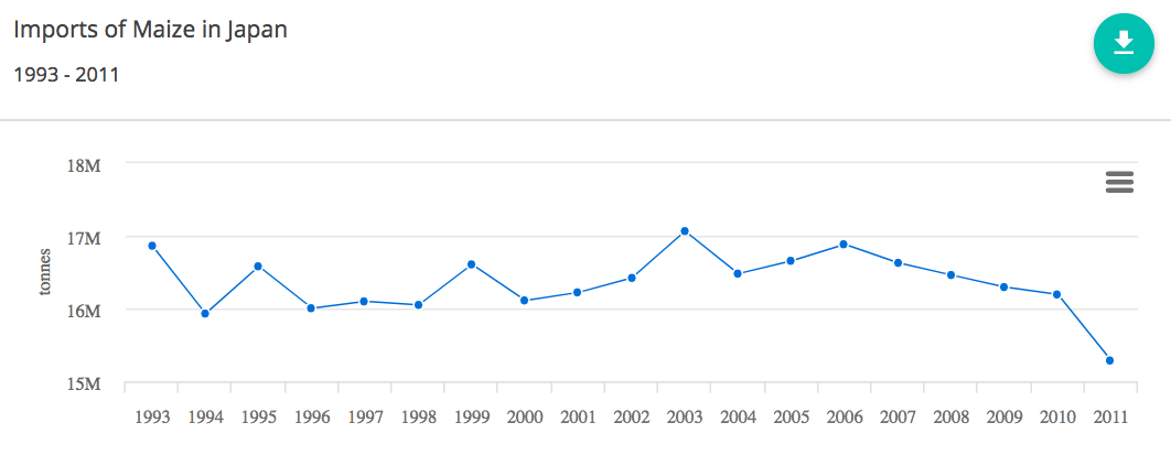 نمودار: ژاپن بزرگترین واردکننده ذرت تراریخته (سالانه ۱۵ تا ۱۷ میلیون تن) در جهان است. (منبع: فائو)