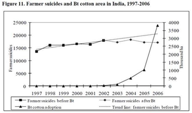نمودار ارائه شده در بالا آمار خودکشی کشاورزان بین سالهای ۱۹۹۷ تا ۲۰۰۶ به همراه درصد پذیرش پنبه تراریخته را نشان میدهد. از نمودار نتیجه گیری میشود که هیچ رابطه مشخصی بین درصد پذیرش پنبه تراریخته و خودکشی کشاورزان وجود ندارد. همچنین رشد سالانه تعداد خودکشی در هند با شروع کشت پنبه تراریخته کاهش یافته است. بیشترین تعداد خودکشی در سالهای ۲۰۰۲ و ۲۰۰۴ رخ داده است در حالی که بیشترین درصد پذیرش در سالهایی رخ داده است که تعداد خودکشیها کاهش یافته است. (NCRB, 1997-2000؛ ایندیا استت ۲۰۰۵؛ کلایو جیمز ۲۰۰۸)